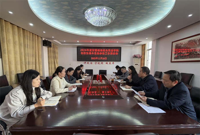 为全面落实国家医疗保障政策,切实保障在校学生医疗健康权益,11月10日,安徽绿海商务职业学院组织召开2026年度在校生基本医疗保险参保工作推进会。学校党委委员、常务副校长陈艺鸣出席会议并讲话,学生处全体工作人员、各二级学院党支部书记及医保工作联络员共同参会。会议由学生处处长韩双喜主持。